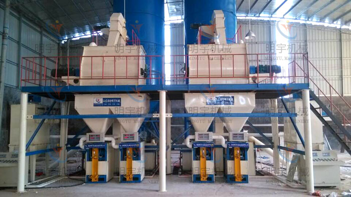 將預(yù)先設(shè)定的配方輸入電腦,水泥沙子等原料根據(jù)配比經(jīng)螺旋輸送機(jī)輸送至配料秤,稱(chēng)量后由斗式提升機(jī)提升至臥式無(wú)重力攪拌機(jī),混合2-3分鐘(根據(jù)不同物料混合時(shí)間略有差別)后落至成品倉(cāng),成品倉(cāng)下部配全自動(dòng)稱(chēng)量包裝機(jī),將混合好的成品裝袋包裝。在包裝過(guò)程中,可以重復(fù)上面配料、提升、攪拌等過(guò)程,以實(shí)現(xiàn)流水線作業(yè),提高生產(chǎn)效率。